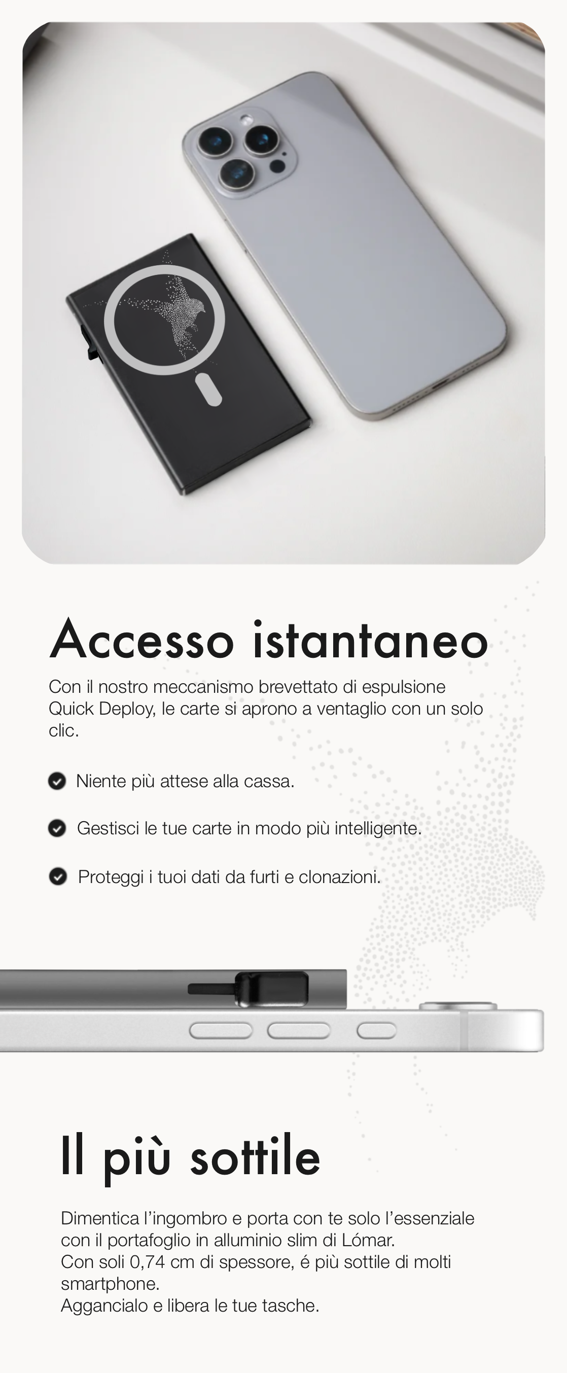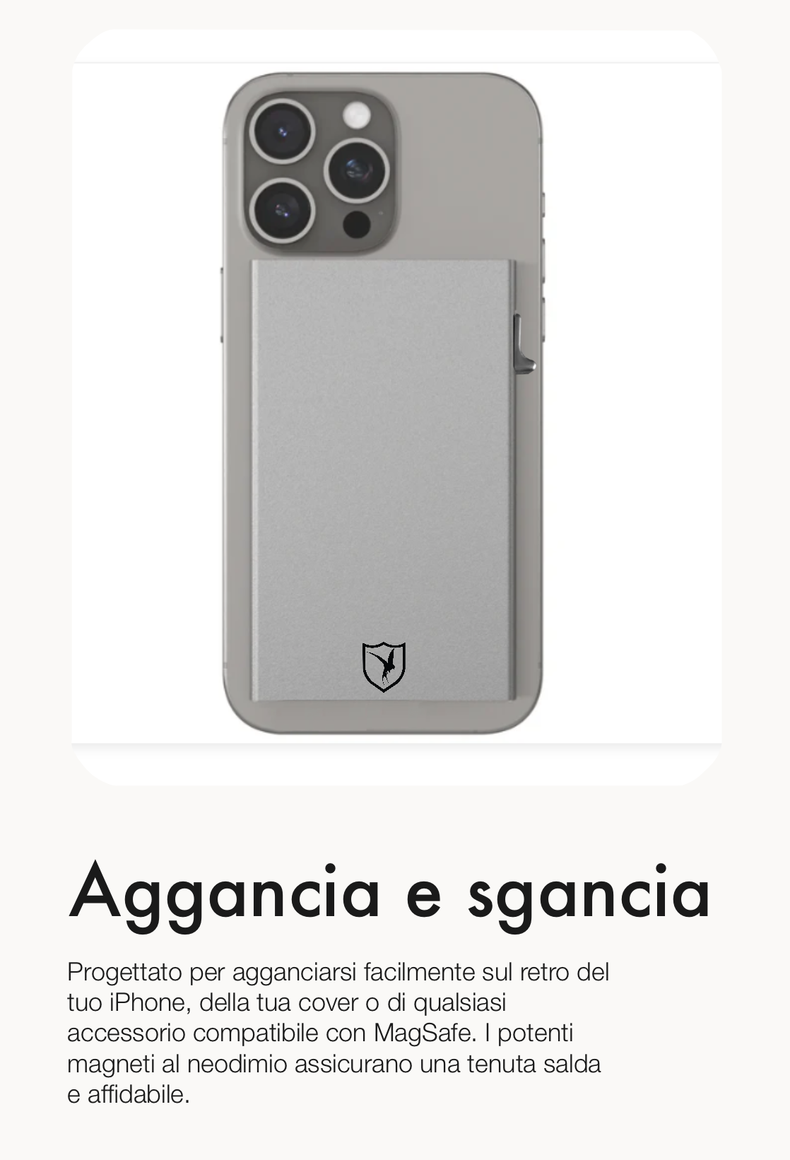 Si aggancia magneticamente al tuo iPhone o agli accessori compatibili con MagSafe grazie a potenti magneti al neodimio, garantendo una connessione estremamente salda. Un portafoglio RFID dal design sottile, pensato per semplificare il modo in cui porti con te carte e contanti. Realizzato in alluminio di grado aerospaziale, utilizza un meccanismo a scorrimento con grilletto che espelle le carte in un istante.