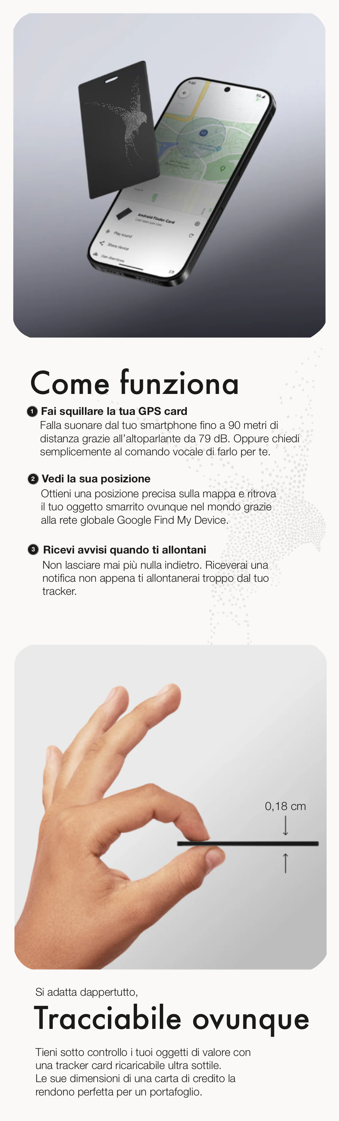 Una card tracker evoluta, sottile e compatta come una carta di credito, pensata per chi utilizza dispositivi Android e desidera monitorare i propri oggetti in qualsiasi momento tramite Google Android Find My Device. Costruita con materiali durevoli e resistenti all’acqua, integra una batteria wireless ricaricabile con autonomia di fino a 1 anno in standby o 6 mesi di utilizzo continuo, garantendo una durata illimitata nel tempo. Un accessorio essenziale per chi vuole proteggere i propri oggetti.